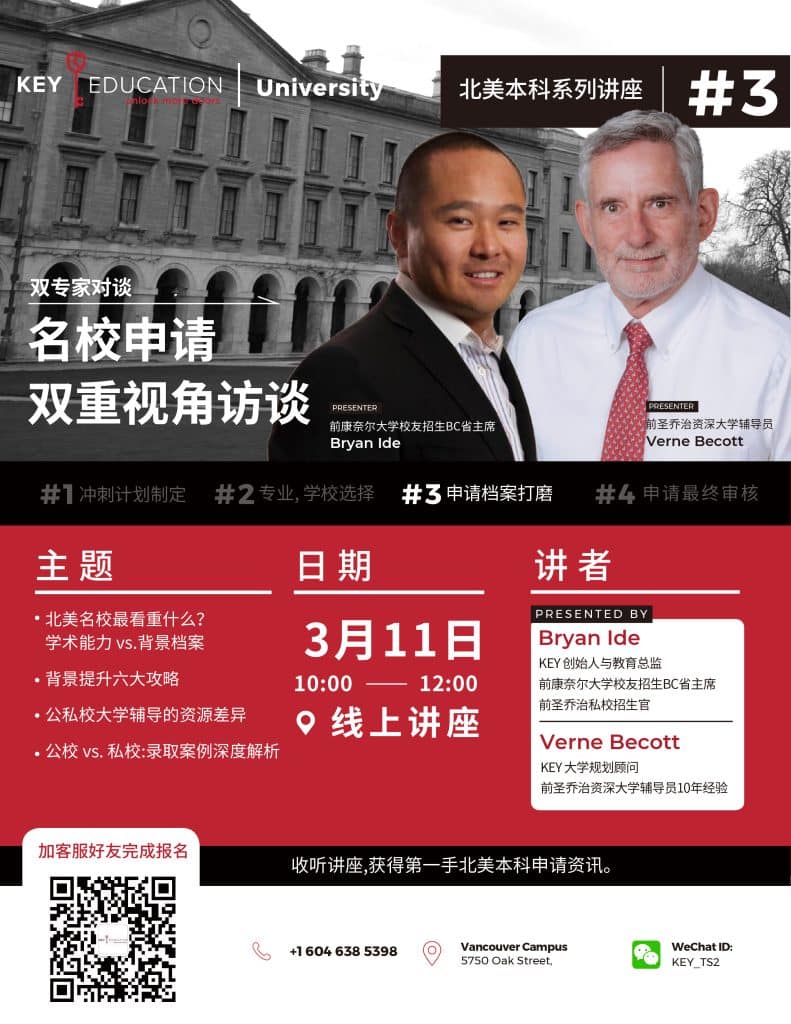 In this seminar, KEY invites a former Cornell University alumni interviewer and a former St. George’s School university counselor to provide in-depth insights from dual professional perspectives. Families will gain a clear understanding of what truly matters in top university admissions and learn practical strategies to enhance competitiveness.
