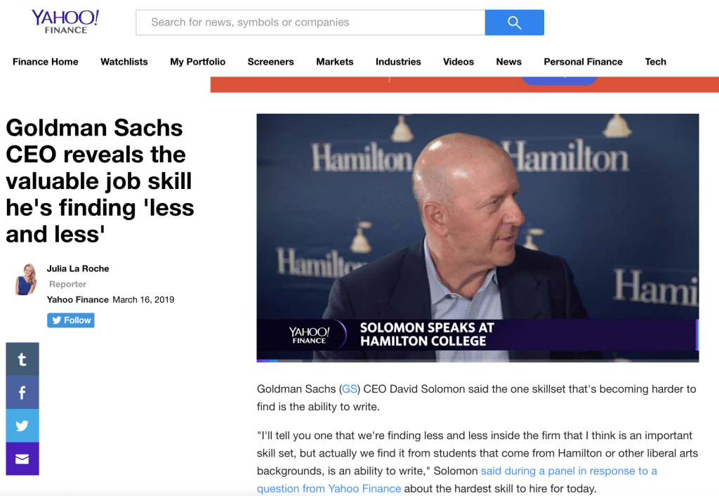 During the interview, Mr. Solomon described that one of the skillsets that are becoming more difficult to find in employees is the ability the write: https://finance.yahoo.com/news/goldman-sachs-ceo-on-hiring-recruiting-skill-151104203.html