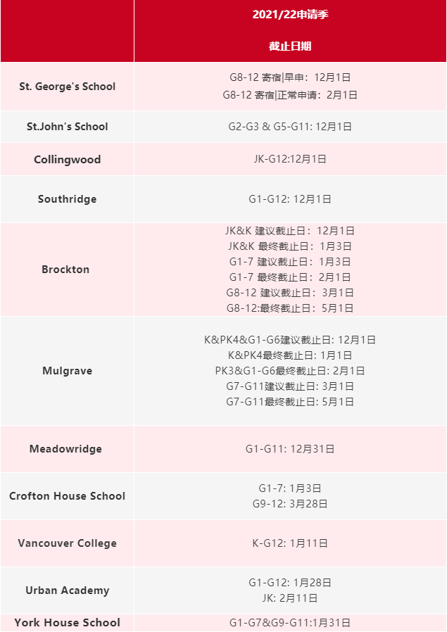 2021-22申请季的第一批私校截止日已经到来,包括St John’s School(JK&K),Southridge(K),West Point Grey Academy(K-G12), 已经在11月1日截止报名。仍计划在今年申请私校的家长需要格外留意目标院校的申请截止日,以免错失机会。为此,KEY特别为各位家长整理了目前仍然开放申请私校的截止日期。