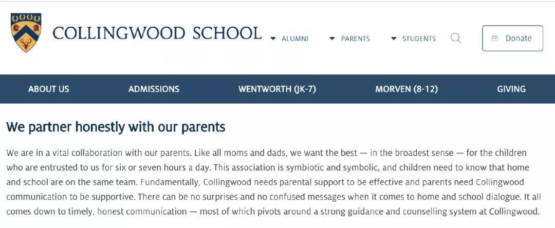 如同Collingwood School网站上明文所示:“学校与家庭间的合作是至关重要的。我们与父母一样希望能够提供给孩子最好的教育,通过建立学生、学校和家庭的团队合作关系,当父母与学校间能有效且及时的沟通与提供支持,并与学校达成一致的合作共识,那么不管学生在学校内或是家中,都能提供给孩子良好的教育质量。”